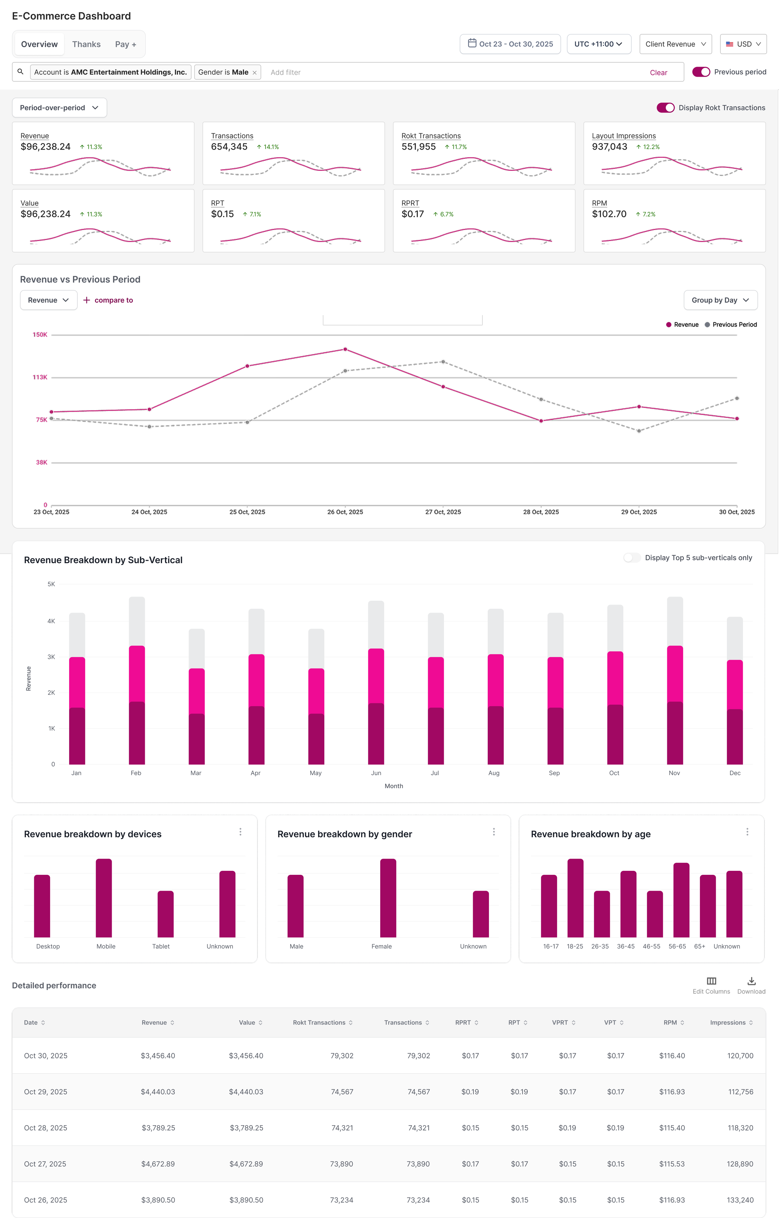 🎯 Impact: Eliminated the need for Account Managers to cross-reference multiple tools during client reviews — consolidating revenue, transaction, and performance data into a single surface that became the primary operational view for partner-facing reporting.